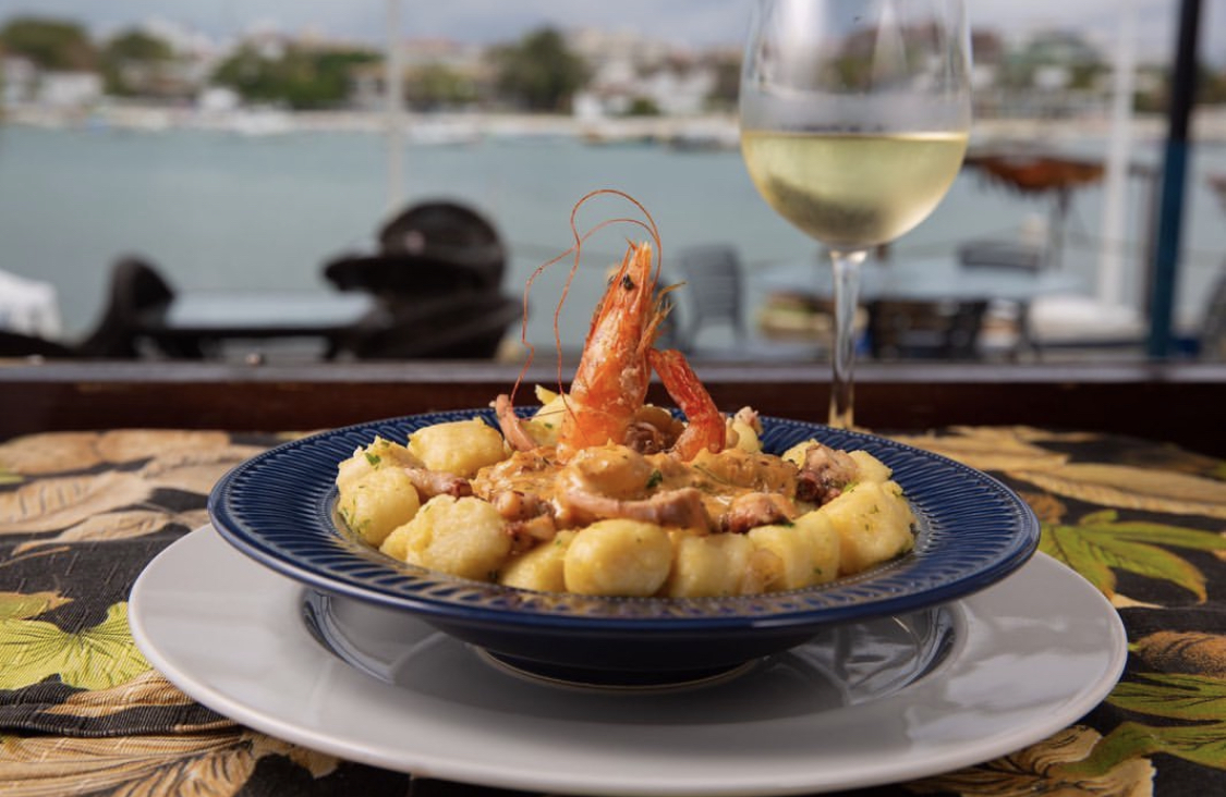 Nhoque de mandioca com camarão e creme de Catupiry gratinado.