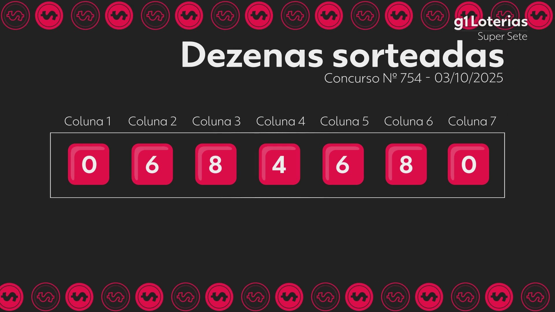 Veja abaixo os números sorteados das colunas no concurso 754 da Super Sete realizado nesta sexta-feira (3):