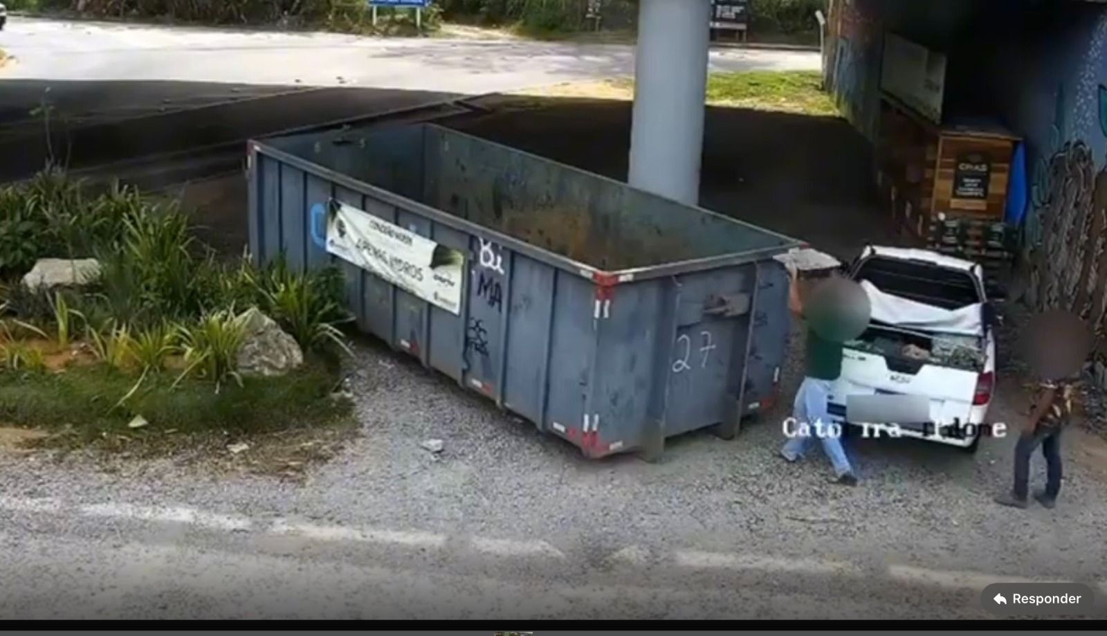 Imagens de câmeras de segurança registraram, nesta quarta-feira (8), dois homens despejando concreto em uma caçamba destinada exclusivamente ao descarte de vidro, no bairro Catobira, em Itaipava, distrito de Petrópolis, na Região Serrana do Rio.