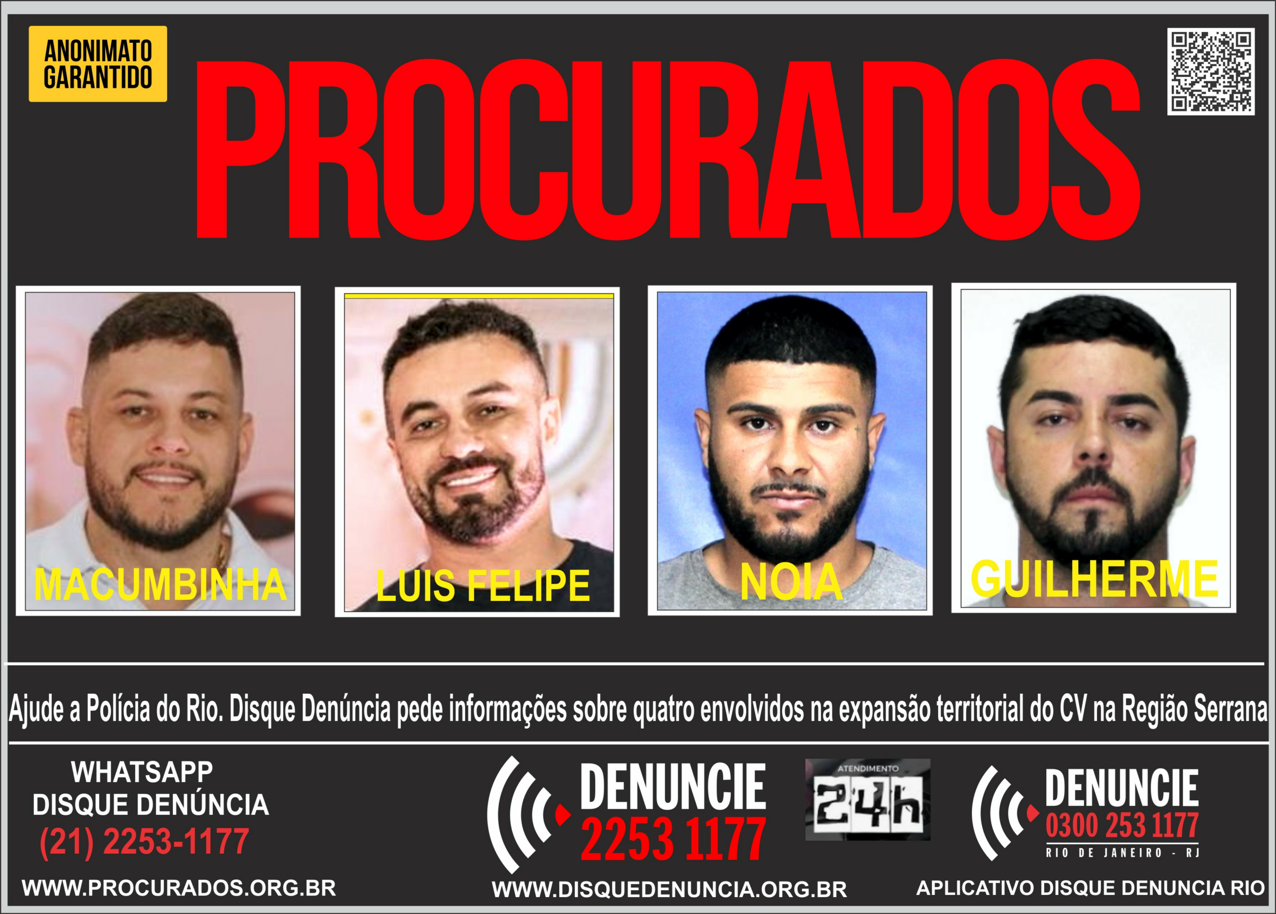 Os procurados são Wando da Silva Costa, o Macumbinha, de 35 anos, apontado pela polícia como chefe do Comando Vermelho (CV) na Região Serrana; Luís Felipe Alves de Azevedo, também de 35 anos, apontado como braço direito de Wando; Paulo Victor Pinho Alves, conhecido como Noia, de 30; e Guilherme Augusto Martins de Oliveira, o Guilherme Escorrega, de 40. Todos são foragidos da Justiça.