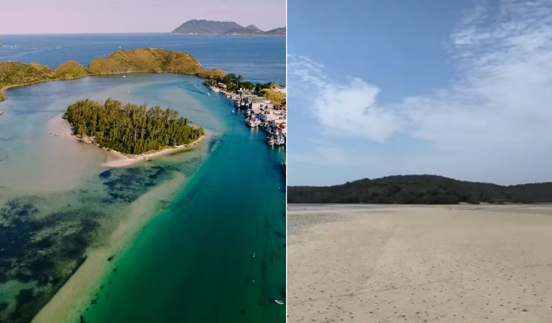 A paisagem paradisíaca da Ilha do Japonês, um dos principais cartões postais de Cabo Frio, na Região dos Lagos do Rio, foi transformada pela maré baixa.