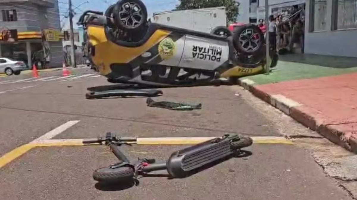 Uma viatura da Polícia Militar capotou durante uma perseguição em Toledo, no oeste do Paraná, e acabou atingindo um adolescente que andava de patinete. O caso aconteceu na última sexta-feira (24), segundo apuração da TV RPC.