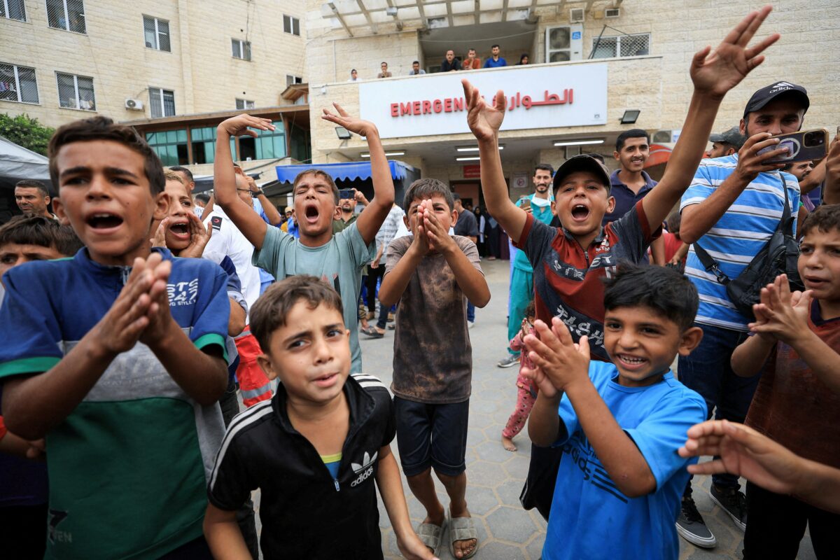 Crianças palestinas comemoram em frente a hospital no centro da Faixa de Gaza