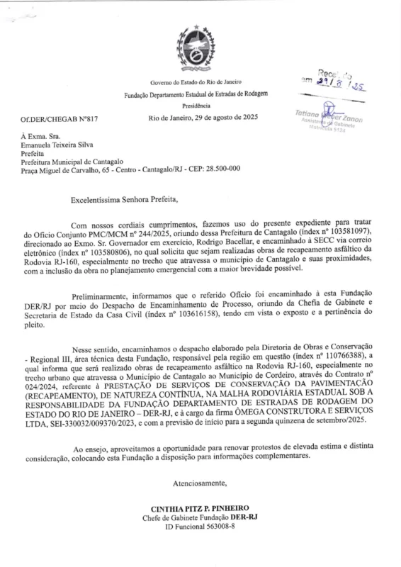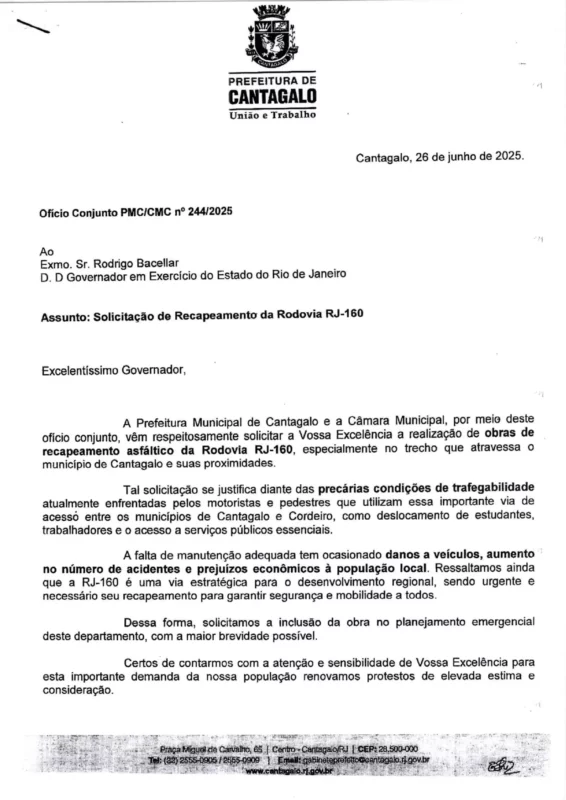 Na correspondência, as autoridades cantagalenses solicitaram o recapeamento asfáltico da Rodovia RJ-160, especialmente no trecho que atravessa o município de Cantagalo e suas proximidades.