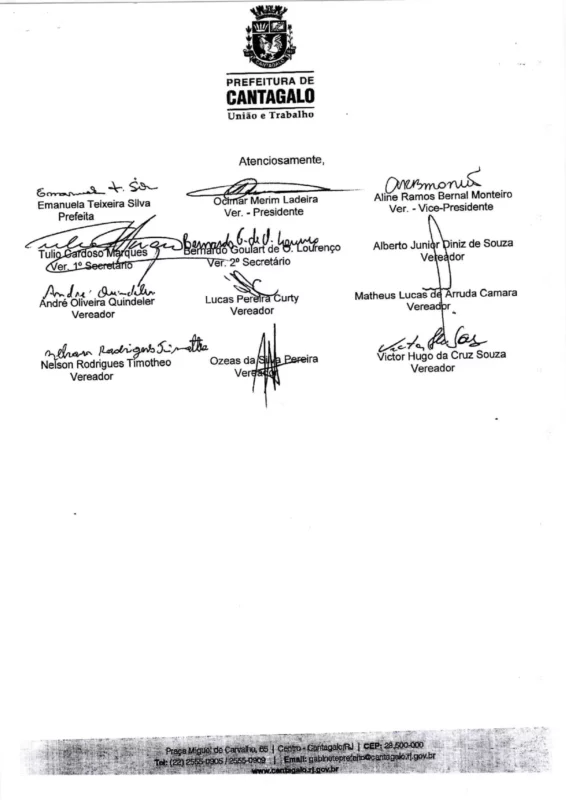 Além da assinatura da prefeita Manuela Teixeira, o ofício foi assinado pelo atual presidente da Câmara, Ocimar Merim Ladeira e os vereadores Aline Bernal; Matheus Arruda; Túlio Cardoso; Bernardo Goulart; Lucas Curty; Nelson Rodrigues Thimothéo; André Oliveira Quindeler; Victor Hugo da Cruz Souza; Alberto Júnior Diniz de Souza; e Ozeas da Silva Pereira.