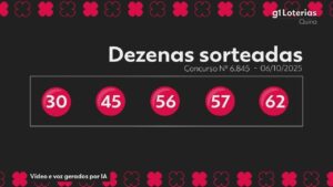 Resultado da Quina g1 Veja abaixo os números do sorteio do concurso 6845 da Quina realizado nesta segunda-feira (6): 30 – 45 – 56 –