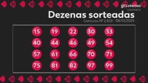 Resultado da Lotomania g1 Veja abaixo os números do sorteio do concurso 2833 da Lotomania realizado nesta quarta-feira (8): 15 – 19 – 22 –