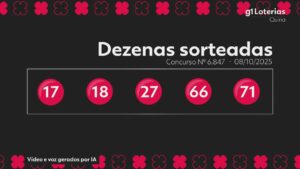 Resultado da Quina g1 Veja abaixo os números do sorteio do concurso 6847 da Quina realizado nesta quarta-feira (8): 17 – 18 – 27 –