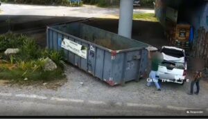 Imagens de câmeras de segurança registraram, nesta quarta-feira (8), dois homens despejando concreto em uma caçamba destinada exclusivamente ao descarte de vidro, no bairro Catobira,