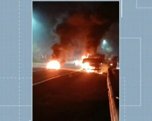 Carreta pega fogo na BR-101 em Campos e causa interdição nos dois sentidos Um caminhão pegou fogo na noite desta sexta-feira (3) na altura da